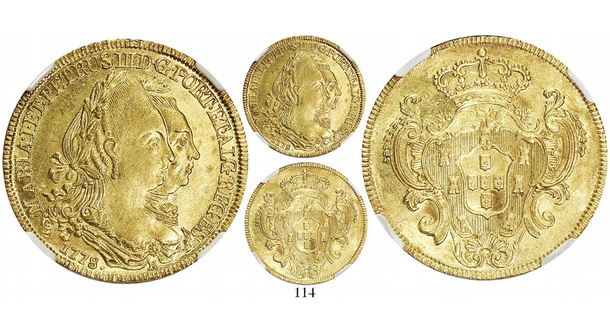 Brazil (Rio mint), 6400 reis, Maria I and Pedro III, 1778-R, encapsulated NGC AU details / surface hairlines. Russo-460; KM-199.2. Nice strike with lustrous fields, old scratches on queen's neck. Pedigreed to the New England Collection.