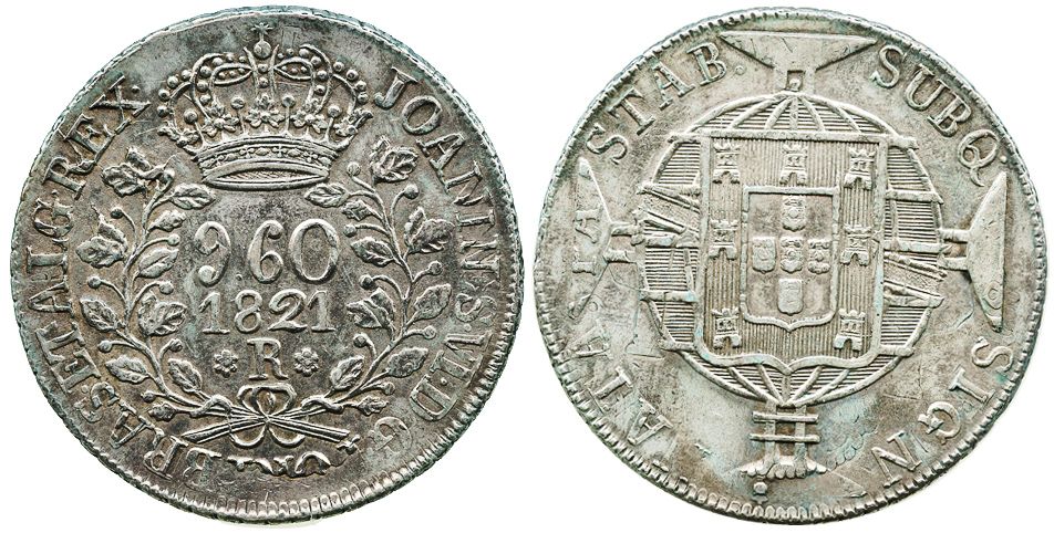 Brazil (Rio mint), 960 reis, 1821-R, struck over an unidentified Spanish colonial bust 8R. KM-326.1. 26.8 grams. Choice XF+ with traces of undercoin visible, weak rims (as made), starting to tone.