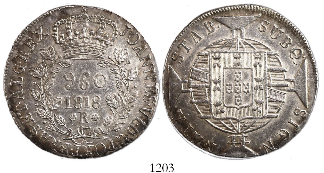 Brazil (Rio mint), 960 reis, Joao Prince Regent, 1818-R, struck over an Argentina (River Plate Provinces) 8 reales or 8 soles (1813 or 1815). Russo-428; KM-307.3. 26.59 grams. Choice AU+ with much luster, rainbow toning at rims, traces of "sunface" design visible (rare undercoin).
