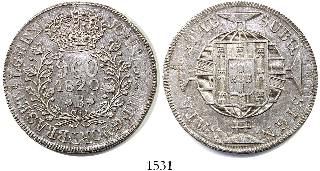 Brazil (Rio mint), 960 reis, Joao VI, 1820-R, struck over a Mexico City, Mexico, bust 8 reales, 1816JJ. Russo-478; KM-326.1. 26.80 grams. Lustrous (lightly cleaned) AU- with bold undercoin date and "interference" near rims.