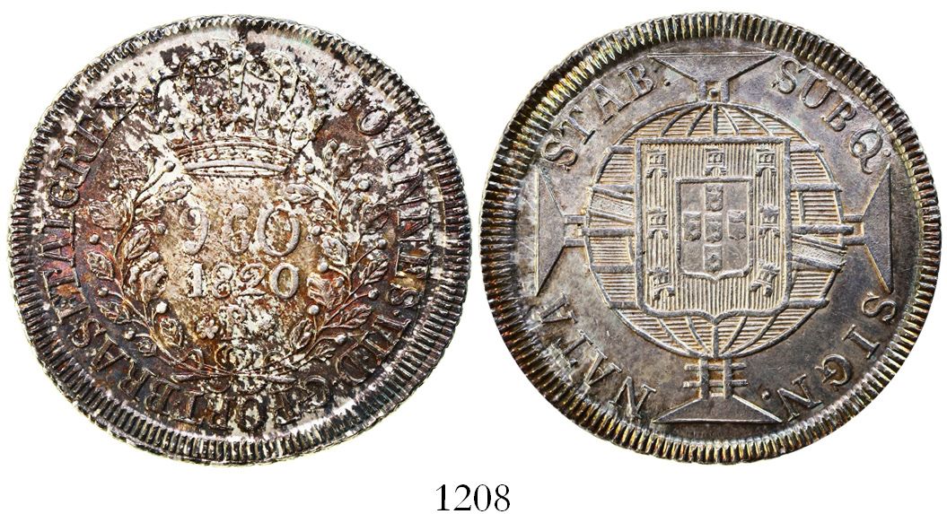 Brazil (Rio mint), 960 reis, Joao VI, 1820-R. Russo-478; KM-326.1. 26.91 grams. Huge-flan Mint State with much luster under and around spots of gorgeous rainbow toning (lots of purple and red color).