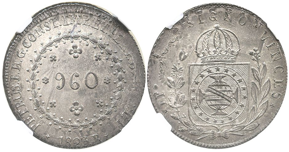 Brazil (Rio mint), 960 reis, Pedro I, 1823-R, struck over an unidentified Spanish colonial bust 8R, encapsulated NGC MS 63. KM-368.1. Broad flan with sharp details, light toning with underlying luster, traces of undercoin visible.