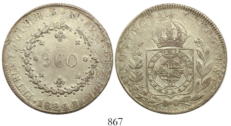 Brazil (Rio mint), 960 reis, Pedro I, 1824-R, struck over a Lima, Peru, "Peru Libre" 8 reales, 1822JP. Russo-505; KM-368.1. 26.65 grams. Lightly toned XF+ with underlying luster, much "interference" from undercoin details (very rare host). With old envelope from previous collector.