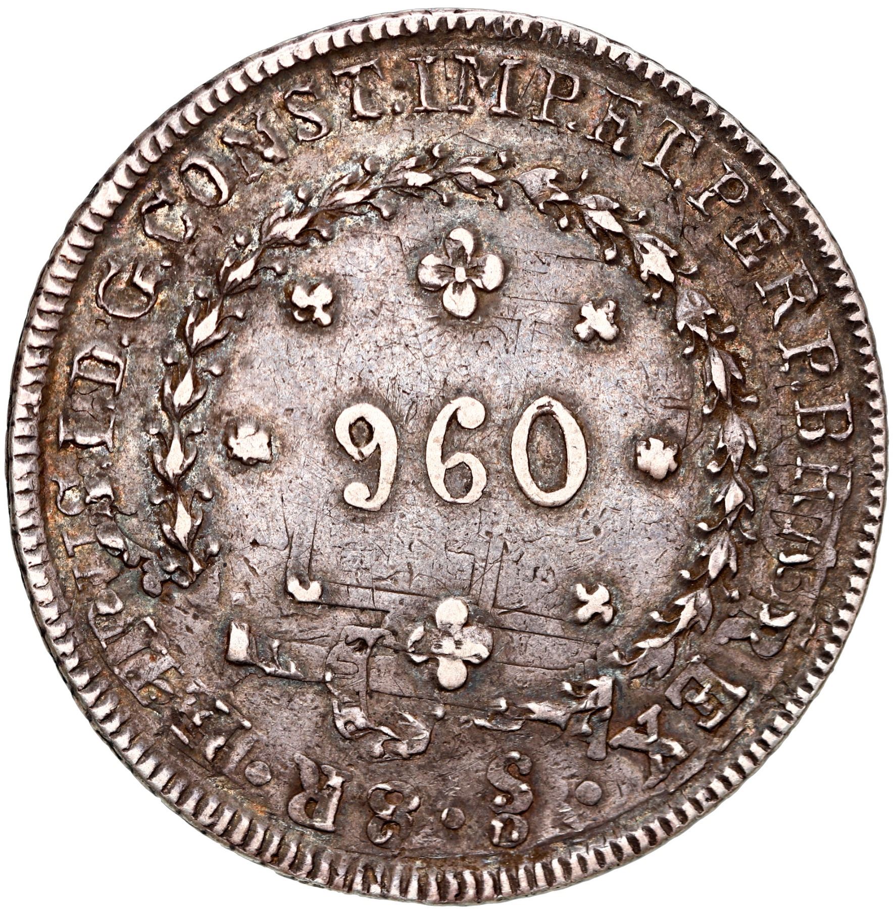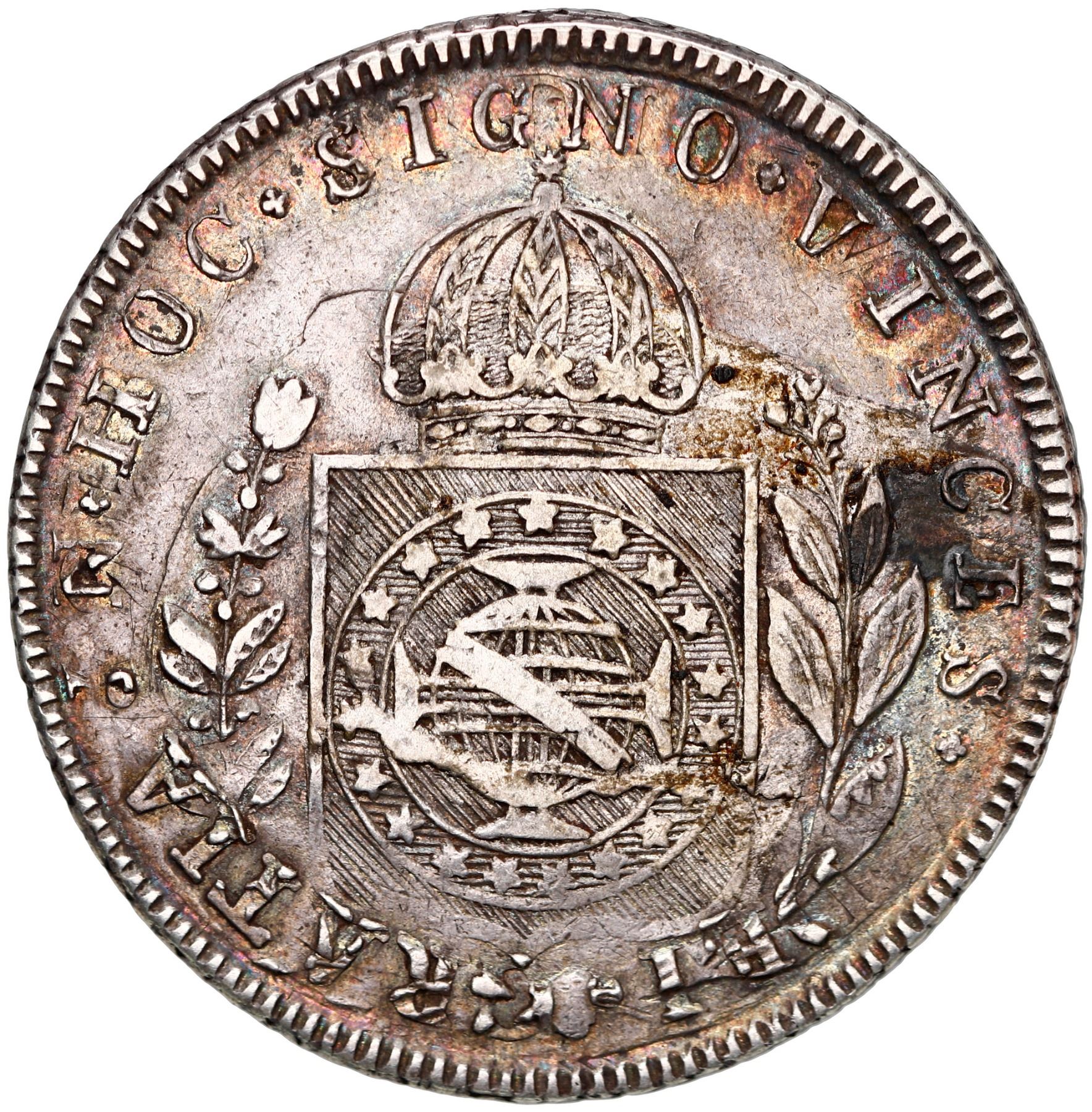 Brazil (Rio mint), 960 reis, Pedro I, 1826-R, struck over a Santiago, Chile, bust 8 reales of 1815 FJ, rare. LMB-507; KM-368. Richly toned XF with one small dark spot, much bold under-coin details including 1815 date and oS mintmark, the overstrike date 1826 only partially visible with what appears to be the lower-right loop of the 6 superimposed on the Santiago mintmark to left of mintmark R.