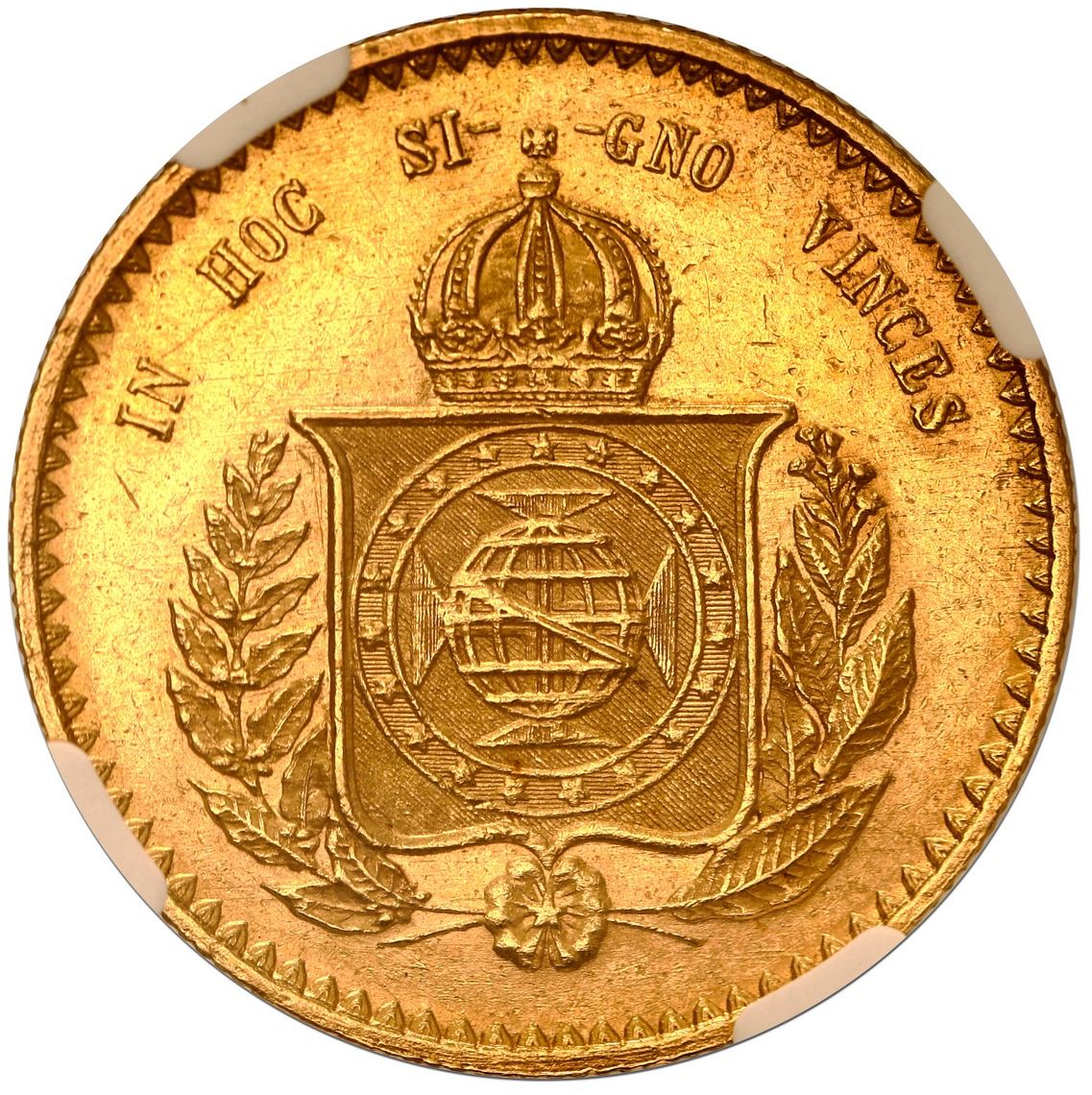 Brazil, gold 20000 reis, Pedro II, 1851, small bust, NGC MS 62. LMB-635; KM-463. Scarce two-year type, well-detailed strike and ample luster, minor marks.