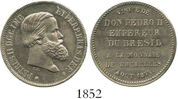 Brazil (struck in Belgium), small nickel(?) medal, Pedro II, 1871, emperor's visit to Brussels. 9.5 grams. Mint State with muted luster, no problems.