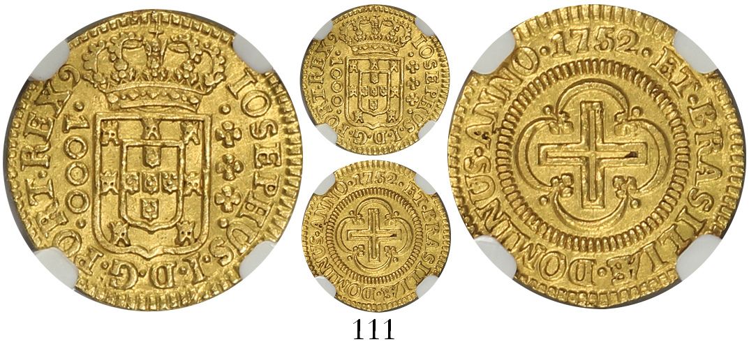 Brazil (struck in Lisbon), 1000 reis, Jose I, 1752, inverted reverse, encapsulated NGC MS 61. Russo-300a; KM-162.1. Nice strike, muted luster but clearly no wear. Pedigreed to the New England Collection.