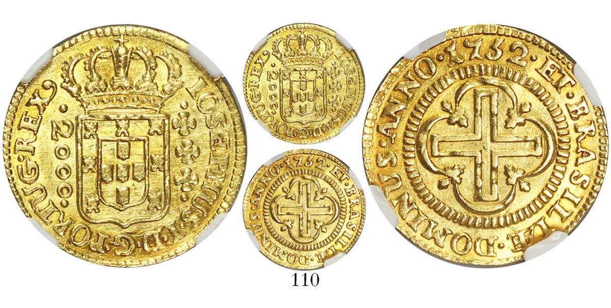 Brazil (struck in Lisbon), 2000 reis, Jose I, 1752, encapsulated NGC AU 58, second finest known in NGC census. Russo-302; KM-182.1. Original mint luster and spots of toning, more like Mint State but with tops of details not fully struck-through. Pedigreed to the New England Collection.