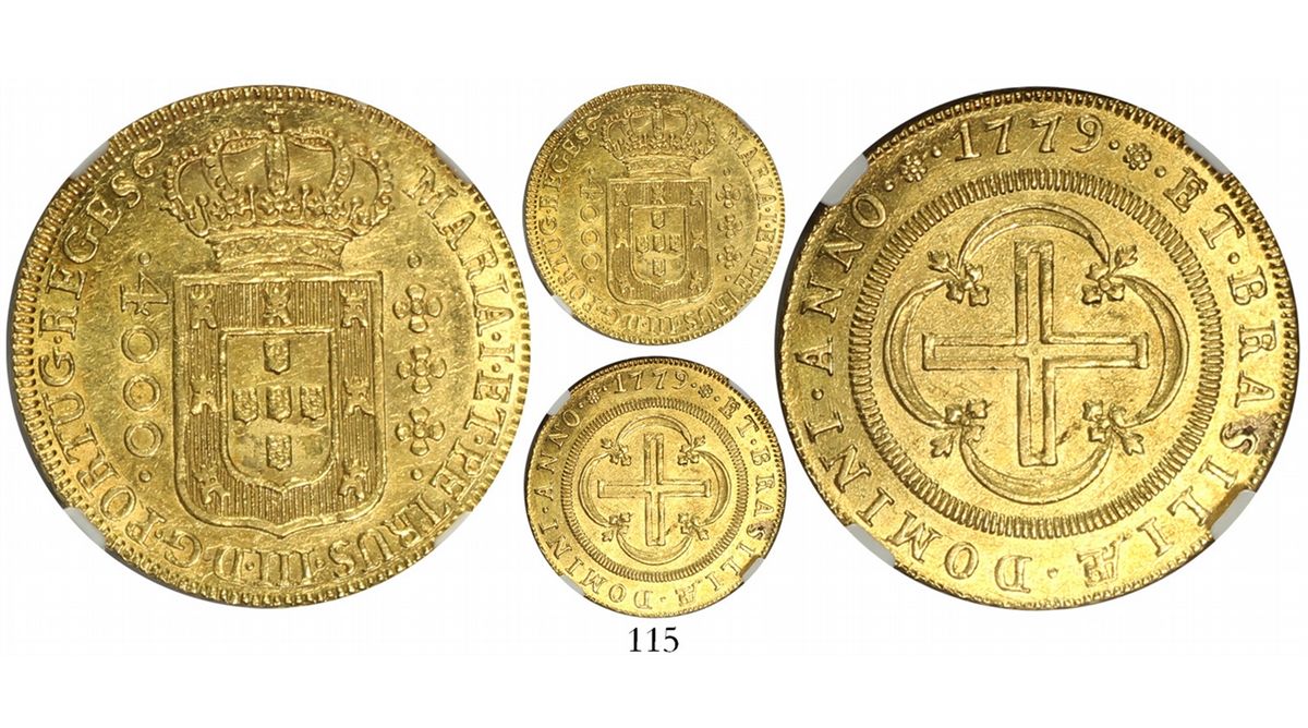 Brazil (struck in Lisbon), 4000 reis, Maria I and Pedro III, 1779, encapsulated NGC MS 62, tied for second finest known in NGC census. Russo-455; KM-210. Excellent strike and lovely luster, and somewhat rare as one of only two coins listed in the current NGC census of gradable specimens. Pedigreed to the New England Collection.
