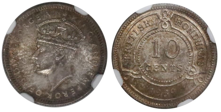 British Honduras, 10 cents, George VI, 1939, encapsulated NGC MS 64. KM-23. 2.32 grams. First year of issue with a mintage of only 20,000 pieces. Fully original with toning over muted luster.