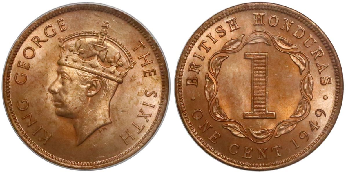 British Honduras, bronze 1 cent, George VI, 1949, encapsulated ANACS MS 64 red. KM-24. Exceptional grade with bright luster and full original color, unpriced in KM above UNC. Purchased from Spink (London) in 1958.