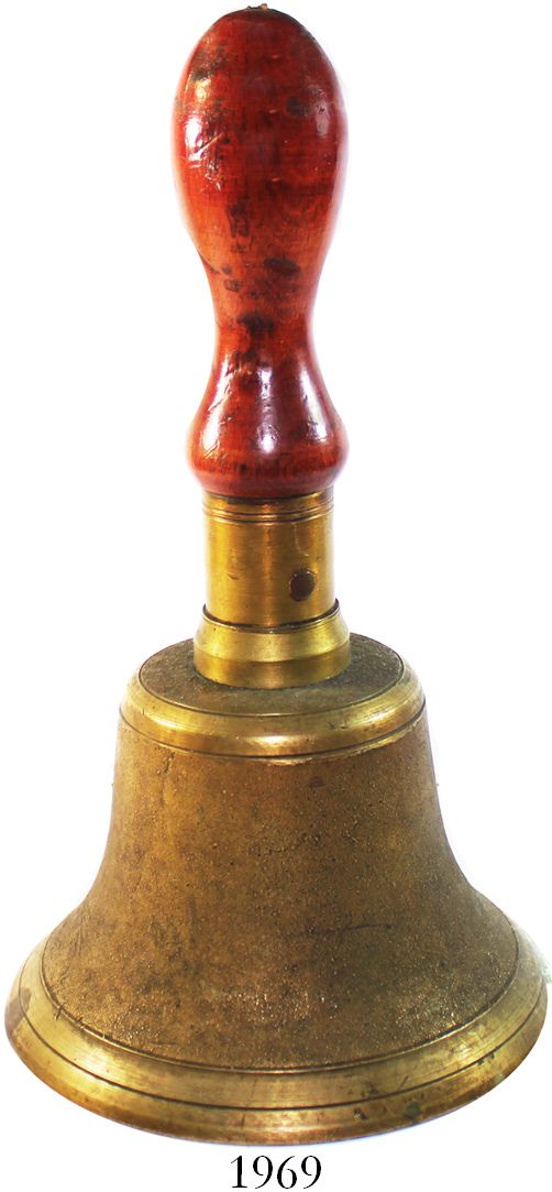 British Royal Navy "deck watch" bell, 1800s, with broad-arrow marks. 1628 grams; 10-1/2" tall. Bright brass color (small spot of green at bottom) with raised broad-arrow design, red-wood handle at top and black-iron clapper inside, fully intact and ring-able (it's loud). With photo-certificate.