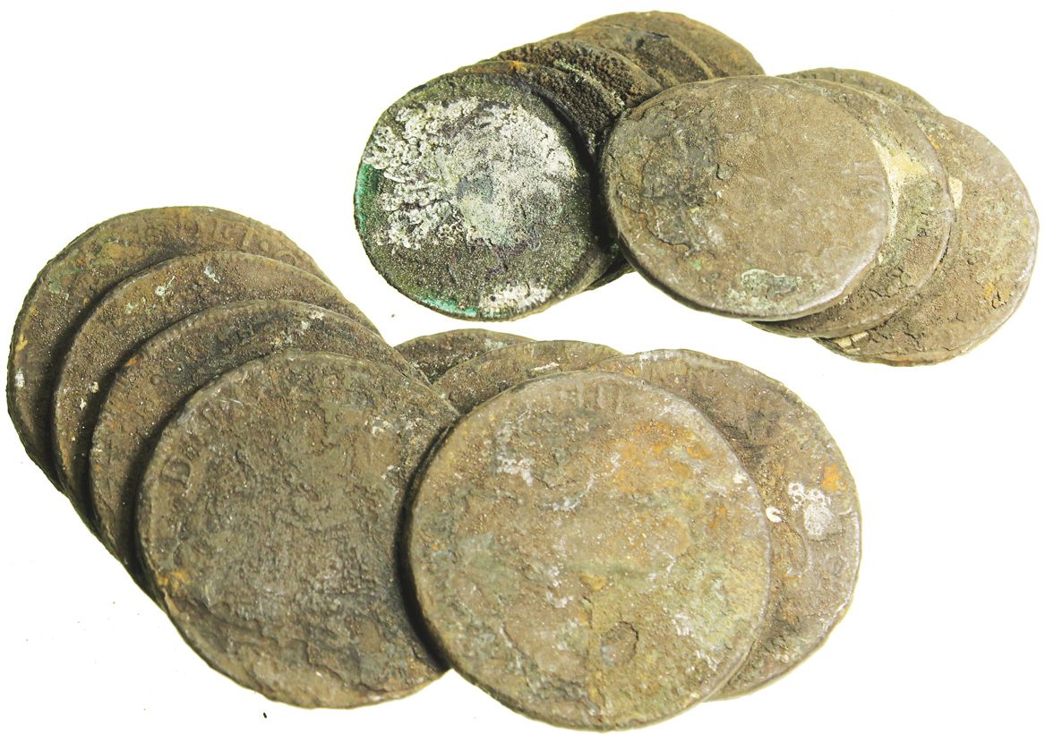 Broadly spread clump (as found) of 8 Spanish colonial bust 8R of Charles III (uncleaned). 193 grams. Solid but dark coins with no details visible, spots of white and tan and green, much better presentation than a simple stack. Recovered from: Cazador, sunk in 1784 off New Orleans in the Gulf of Mexico