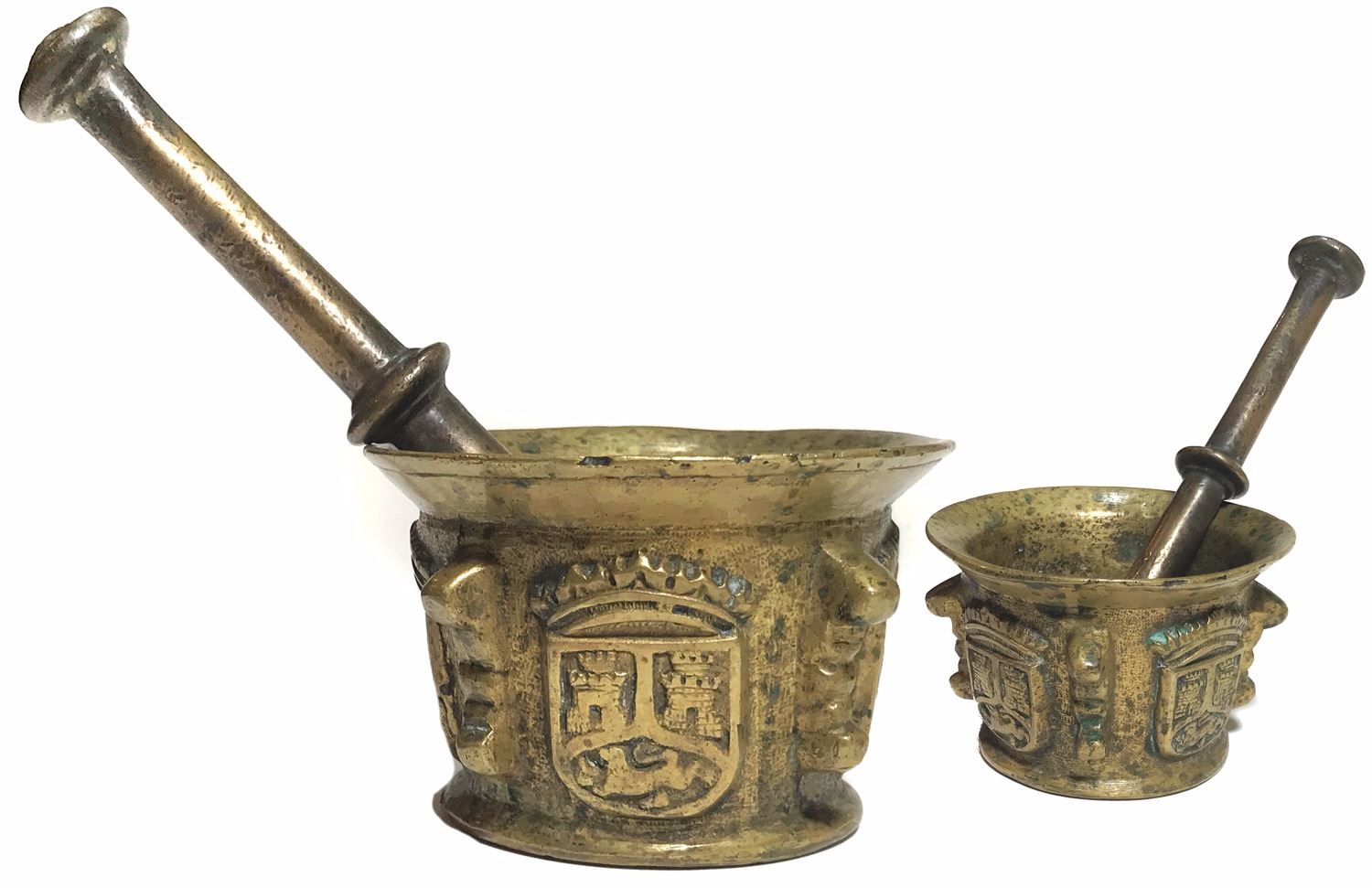 Bronze Spanish mortar and pestle with castles-and-lion decoration, 1600s. 1,560 grams, 4-1/4" diameter, 2-3/4" tall, 7-3/8" long pestle. Large, heavy mortar used by a chemist to produce medicines, with relief-cast shield featuring two castles over a rampant lion on exterior (presumably the crest of the House of Enriquez, a Spanish Royal family founded in the 14th century), all brassy in color, with numerous dents and wear from age use. With photo-certificate.