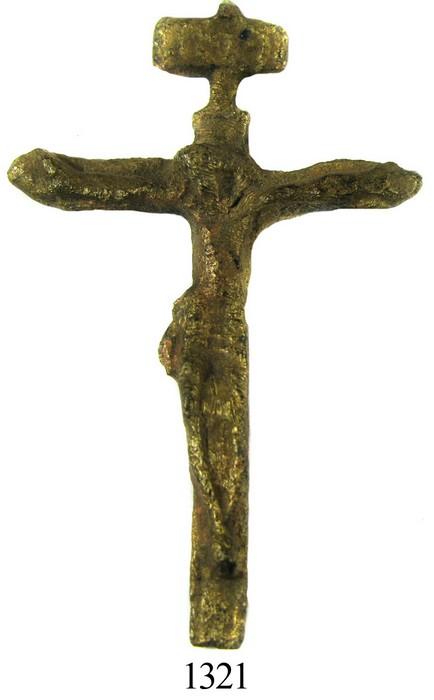 Bronze crucifix. 6.0 grams, 2" x 1-3/8". Christ figure and cross all in one piece, with INRI in box at top, complete but a bit worn and corroded, very recognizable and popular. Recovered from: "Cidade Velha wrecks," sunk in the late 1500s off the Cape Verde Islands, west of Africa. With Arqueonautas certificate #AGO-050/98/944.01.