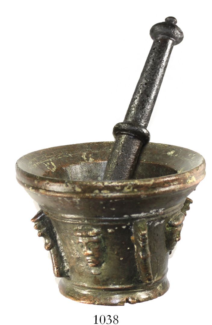 Bronze mortar and pestle set, faces and fins design. 4.3 kg total, the mortar 6" in diameter and 4-1/4" tall, the pestle 10-1/4" long and about 1-5/6" in diameter. Heavy and intact, the mortar lighter in color and decorated on the outside with four panels containing one face each, separated by fin-like protrusions, the pestle more typical with tiny knob at end and raised ring in center, also with surface corrosion on the pestle only, the mortar with small bits of white encrustation. From the mid-1500s "Pewter Wreck," with Global Marine Exploration photo-certificates #PC01965 and 2215. Recovered from: "Pewter Wreck," sunk in the mid-1500s off Santo Domingo