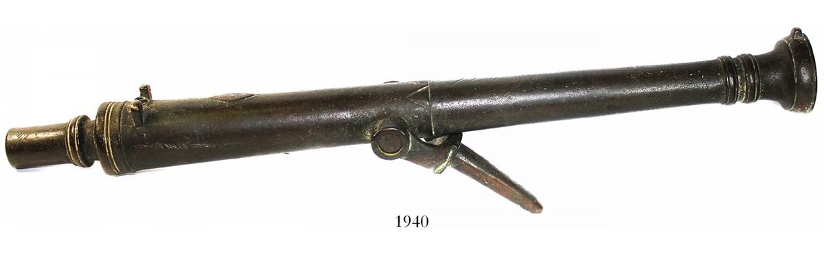 Bronze rail cannon, Portuguese or Malaysian, late 1700s-early 1800s. 20 lb, 9 oz; 28" long. Cute little cannon with minimal design but attractive proportions, the muzzle thick and somewhat bulbous (1" bore), yoke and trunnions intact, sights on muzzle and flanking the touch-hole, deeply cylindrical cascabel (wooden tiller-handle typically missing), dark bronze color all over with light patina and encrustation in crevices. Pedigreed to the Bonhams (San Francisco) auction of November 20, 2007, lot #3312.
