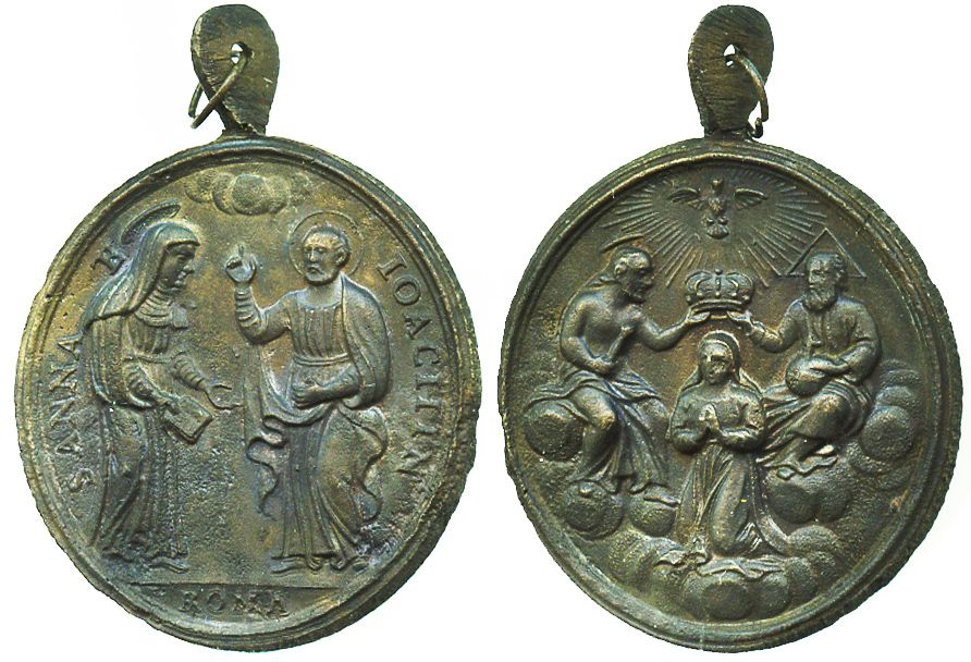Bronze religious medallion, Sts. Anna and Joachim, ca. 1700s-1800s (Rome). 40x36.5mm; 26.5 grams. Very high-relief and top-grade oval medallion of substantial size, with Saints Anna and Joachim on one side (legend S ANNA E / IOACHIN, exergue ROMA), Holy Trinity on other side (Father and Holy Spirit crowning Jesus in center), darkly toned and with light surface corrosion (possibly salvaged) and with top loop slightly bent (with tiny jump-ring), but no wear at all. Anna and Joachim were the parents of the Virgin Mary.