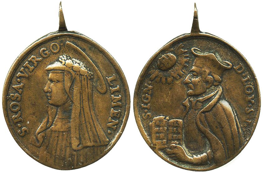 Bronze religious medallion of the virgin Santa Rosa de Lima, ca. 1720s. 38x35mm; 15.4 grams. A well-preserved oval Jesuit medallion of substantial size, fully intact, with Santa Rosa de Lima on one side (legend S.ROSA.VIRGO / LIMEN.) and Santo Ignacio de Loyola on the other (legend S.IGN. / D.LOY.S.J), all lightly worn but with nicely contrasting toning against light copper fields. Santa Rosa de Lima (born in 1586) was considered the first American saint.