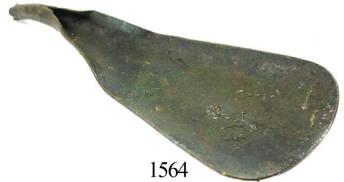 Bronze scoop. 72 grams, 6¾" x 2-3/8". This looks just like a modern shoe-horn but was probably some kind of long scoop with rolled end for attaching to a wooden handle. Found in a Spanish colonial area in the southern Caribbean, ca. 1590.
