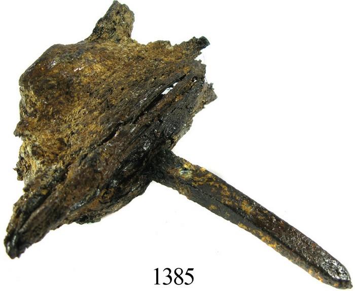 Bronze spike in wood section. 180 grams, 5½" x 4½" x 2". A complete bronze spike (square) driven into a thick piece of ship's hull with whitish encrustation on one side, preserved and lacquered to prevent decay. Recovered from: Spanish 1715 Fleet, east coast of Florida. From the Corrigans wreck site.