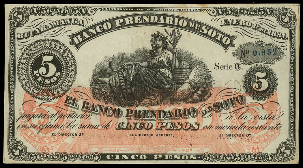 Bucaramanga, Colombia, Banco Prendario de Soto, 5 pesos, 1-9-1886, series B, serial 0852. SCWPM-S796a; CHPM-9266. AU+ with small corner tip fold at upper right and a few light stains, very bold design as printed by D. Paredes in Bogota, a fairly scarce type and the only collectible denomination known for this private bank.