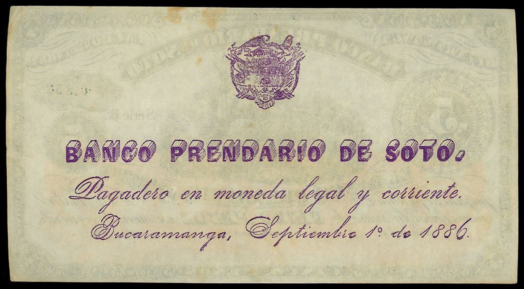 Bucaramanga, Colombia, Banco Prendario de Soto, 5 pesos, 1-9-1886, series B, serial 0852.