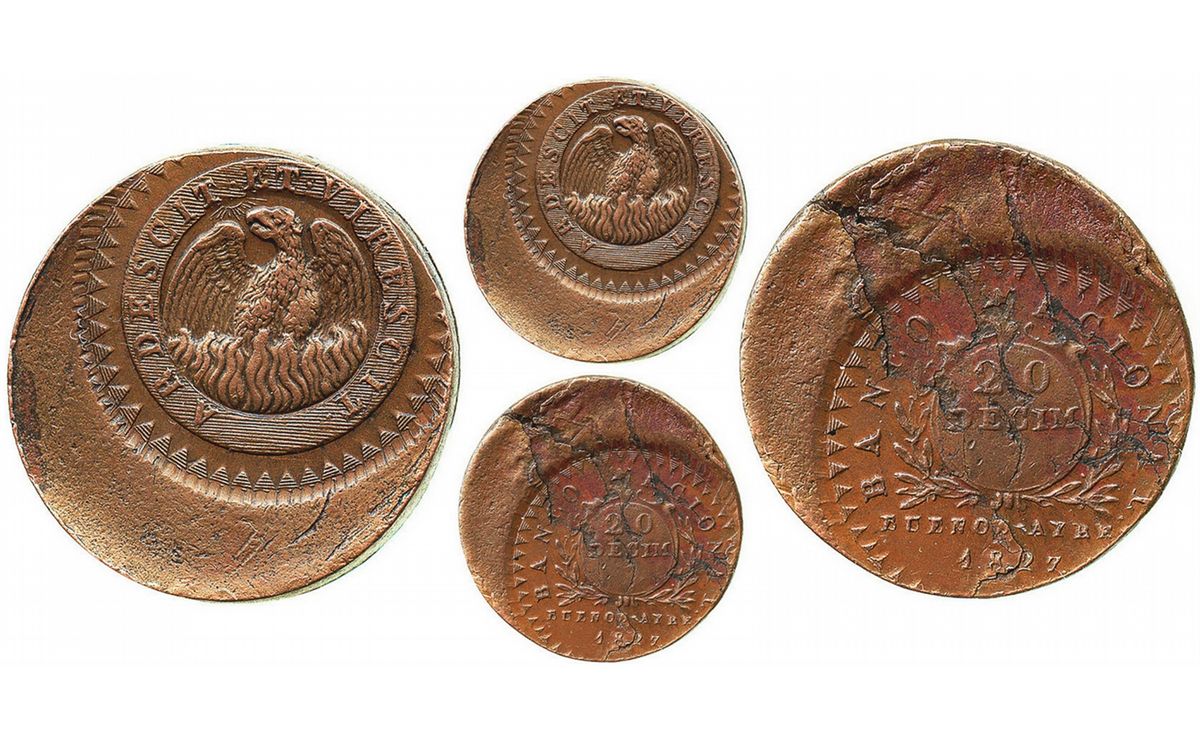 Buenos Aires, Argentina (National Bank), copper 20 decimos, 1827, rare error struck about 30% off-ce