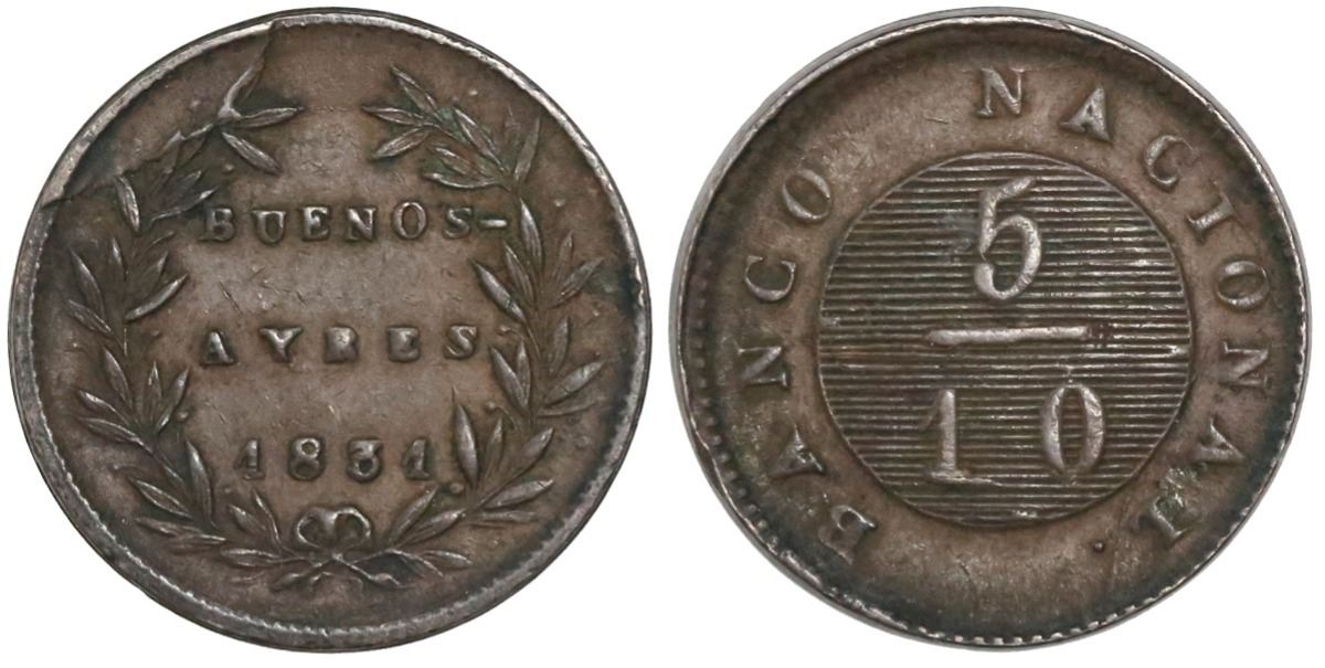 Buenos Aires, Argentina (National Bank), copper 5/10 real (5 decimos), 1831/27.