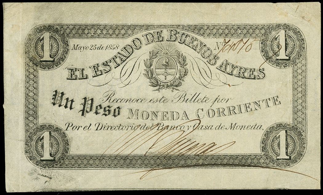 Buenos Aires, Argentina, Provincia de Buenos Aires, 1 peso, 25-5-1858, serial 101010.