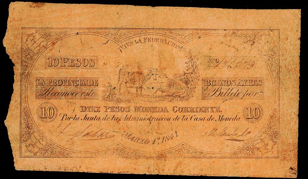 Buenos Aires, Argentina, Provincia de Buenos Aires, 10 pesos, 1-3-1841, serial 143373.