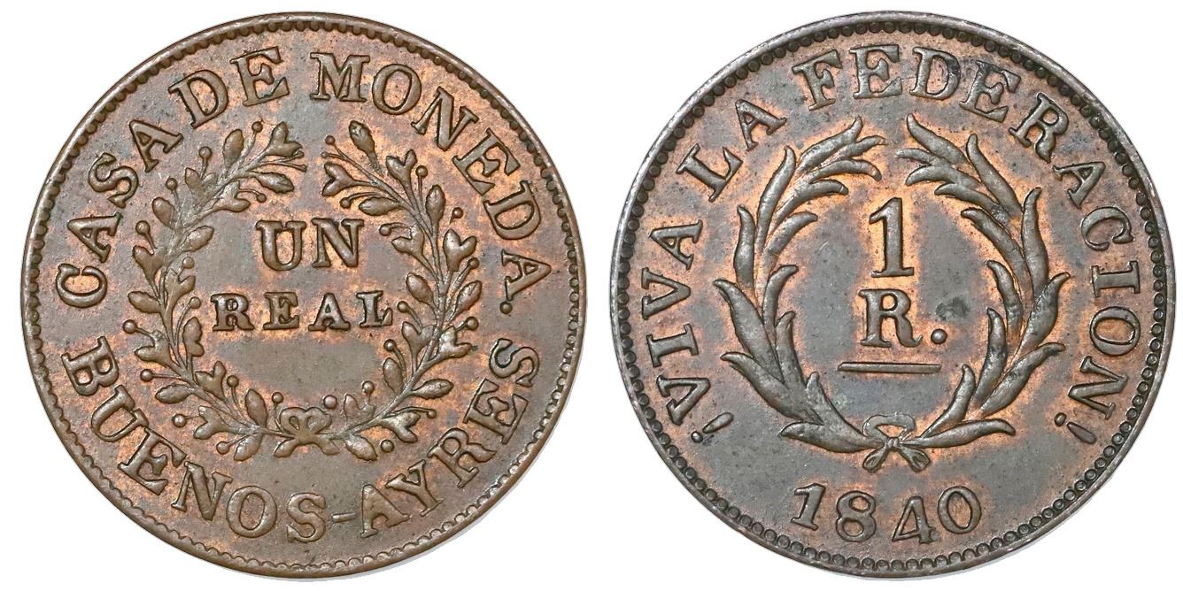 Buenos Aires, Argentina, copper 1 real, 1840, NGC MS 62 BN, ex-O'Brien. Janson-16.1.10; KM-7. Nice strike (no weak spots) with traces of original color and luster around details, early one-year type in desirable grade. NGC #4771567-005. Pedigreed to the John O'Brien collection (stated on label).