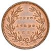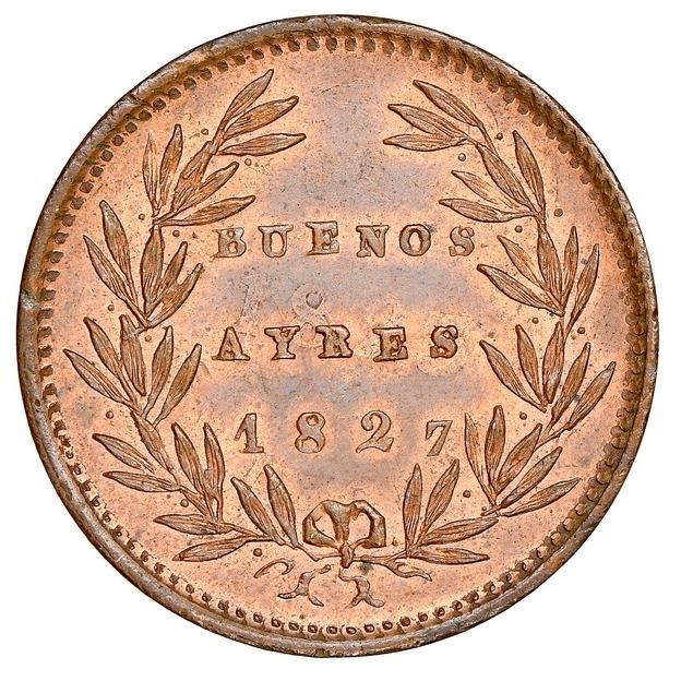 Buenos Aires, Argentina, copper 5/10 real, 1827, struck over an 1823 decimo, NGC MS 65 RB, finest known in NGC census, ex-Carter, ex-O'Brien. Janson-9.1; KM-3. Beautiful deep strike with lovely original luster and much copper color, ghost of 1823 host date visible in center, the finest of over a dozen entries in the NGC census (including BN, none rated RD) and nicely pedigreed. Pedigreed to the Amon Carter collection (Coin Galleries auction of November 15, 1989, lot #1496), and to the John O'Brien collection (stated on label). NGC #5905411-002.