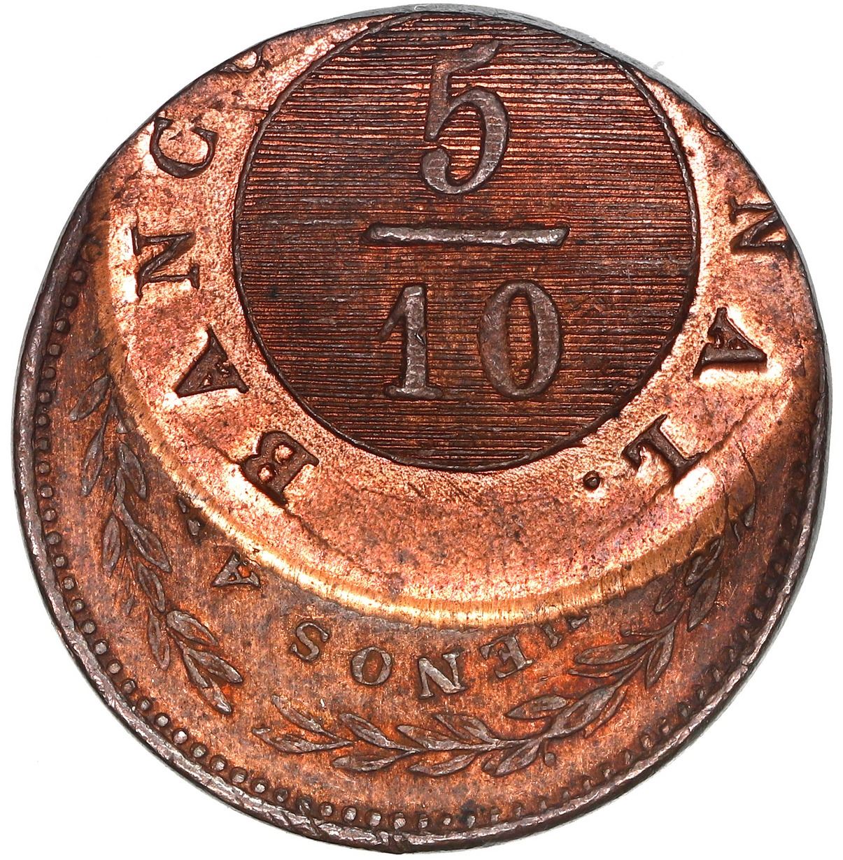 Buenos Aires, Argentina, copper 5 decimos, 1827, coin axis, struck 30% off-center over a 1 decimo of 1822-3, NGC Mint Error MS 65 RB, finest known in NGC census. Janson-9; KM-3. Choice luster and original copper color, with full details on 30% of the under-coin (darker) visible due to the centering error.
