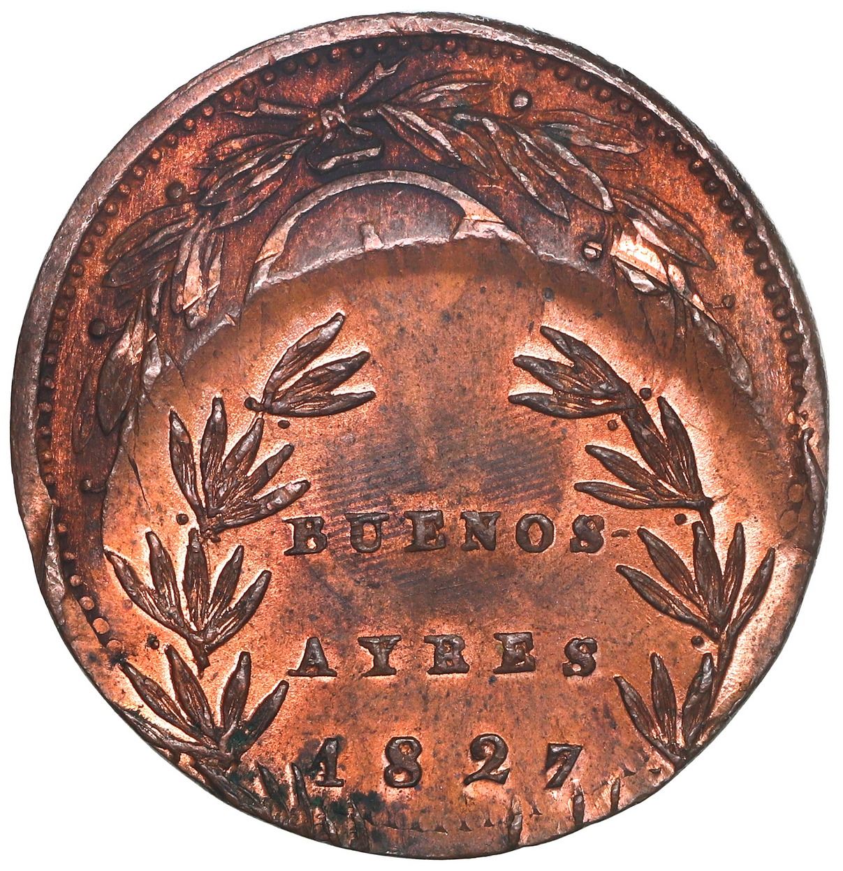 Buenos Aires, Argentina, copper 5 decimos, 1827, coin axis, struck 30% off-center over a 1 decimo of