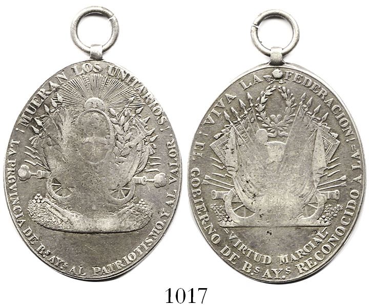Buenos Aires, Argentina, oval silver medal with loop (military award), Battle of Arroyo Cayasta under Rosas (1840). 16.00 grams total. Legends read MUERAN LOS UNITARIOS! LA PROVINCIA DE B.S AY.S AL PATRIOTISMO. Y AL VALOR on obverse and VIVA LA FEDERACION! EL GOBIERNO DE B.S AY.S RECONOCIDO A LA / VIRTUD MARCIAL on reverse, both sides showing arms and cannons in centers, toned VF with weak centers, important and valuable issue featured in Cunietti's Historia de las Medallas Argentinas 1747-1880.