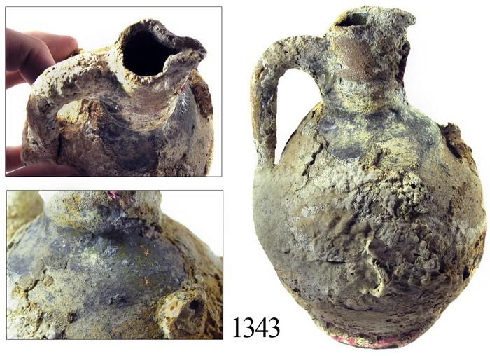 Bulbous earthenware decanter. 538 grams, 7" tall and 4½" in diameter. Fully intact but heavily encrusted small pitcher with pinched lip, flat base, grayish surfaces where not encrusted with whitish, wormy coral, a very attractive artifact. Recovered from: Sacramento, sunk in 1668 off the Bay of All Saints, Bahia, Brazil.
