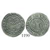 Burgos, Spain, 1/2 real, Ferdinand-Isabel, assayer scallop. CT-423. 1.7 grams. Broad flan with full Gothic legends that show circles and Jerusalem cross at top of obverse, scallop and Jerusalem cross at top of reverse, nice full arrows on obverse and yoke above mintmark dot-B-dot on reverse AXF with contrasting toning.