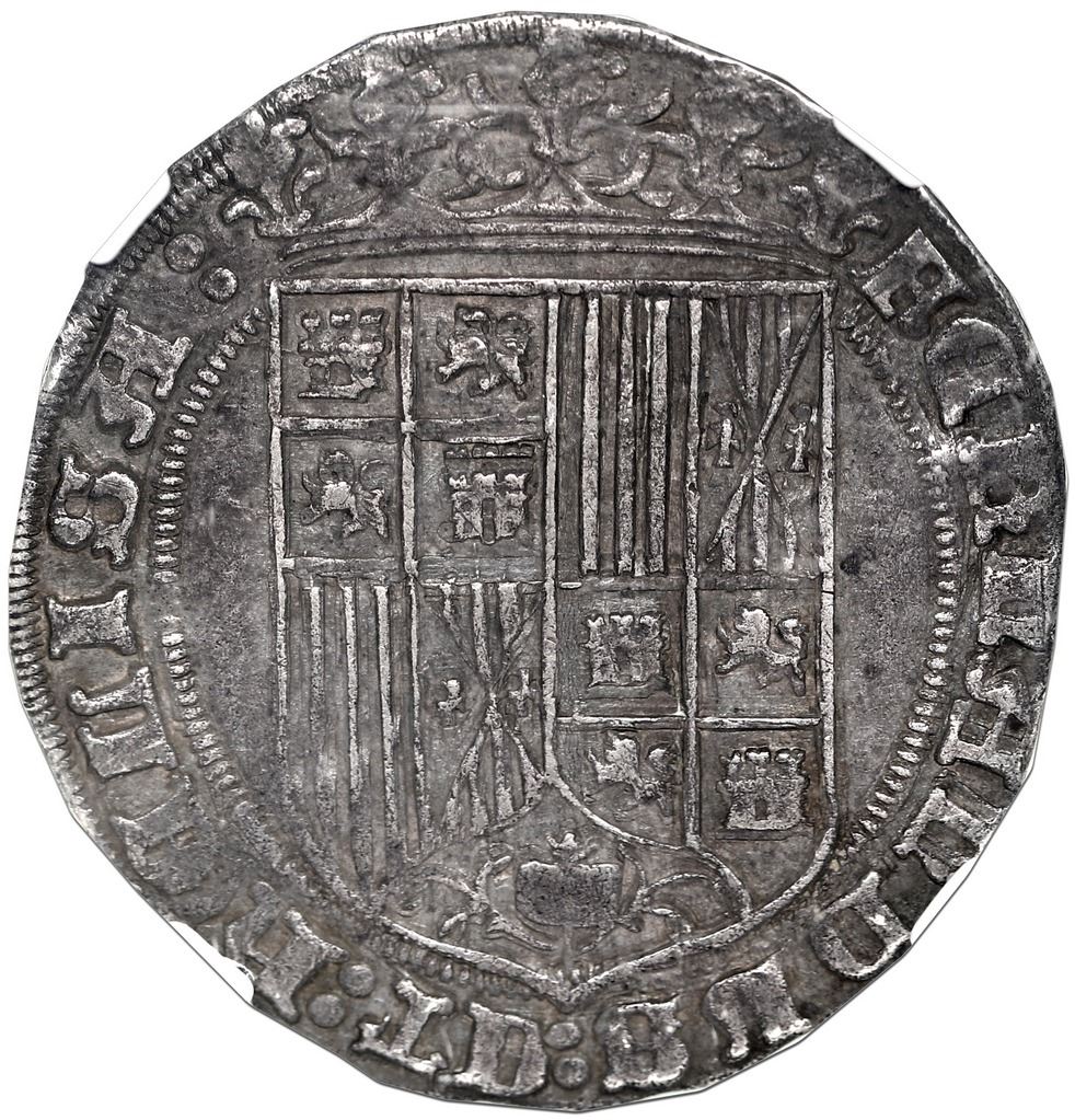 Burgos, Spain, 1 real, Ferdinand-Isabel, mintmark B on reverse with assayer X to left of cross potent in legend, NGC XF 40. Lopez de la Fuente-F1.6.1.12; Cal-317. 3.23 grams. Deeply toned and fully detailed, including legends, the high points evenly worn.