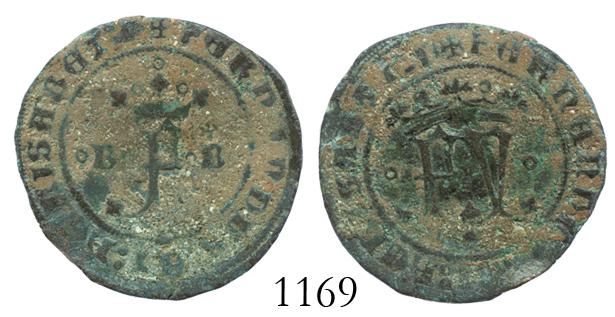 Burgos, Spain (for the New World), copper 2 maravedis, Ferdinand-Isabel, rare. 3.3 grams. Rare special coinage struck for New World use only, with crowned Y and F flanked by small circles on obverse, crowned F flanked by mintmark B and small circles on reverse, broad flan with much legend and nice VF details but encrusted all over with dark orange sediment.