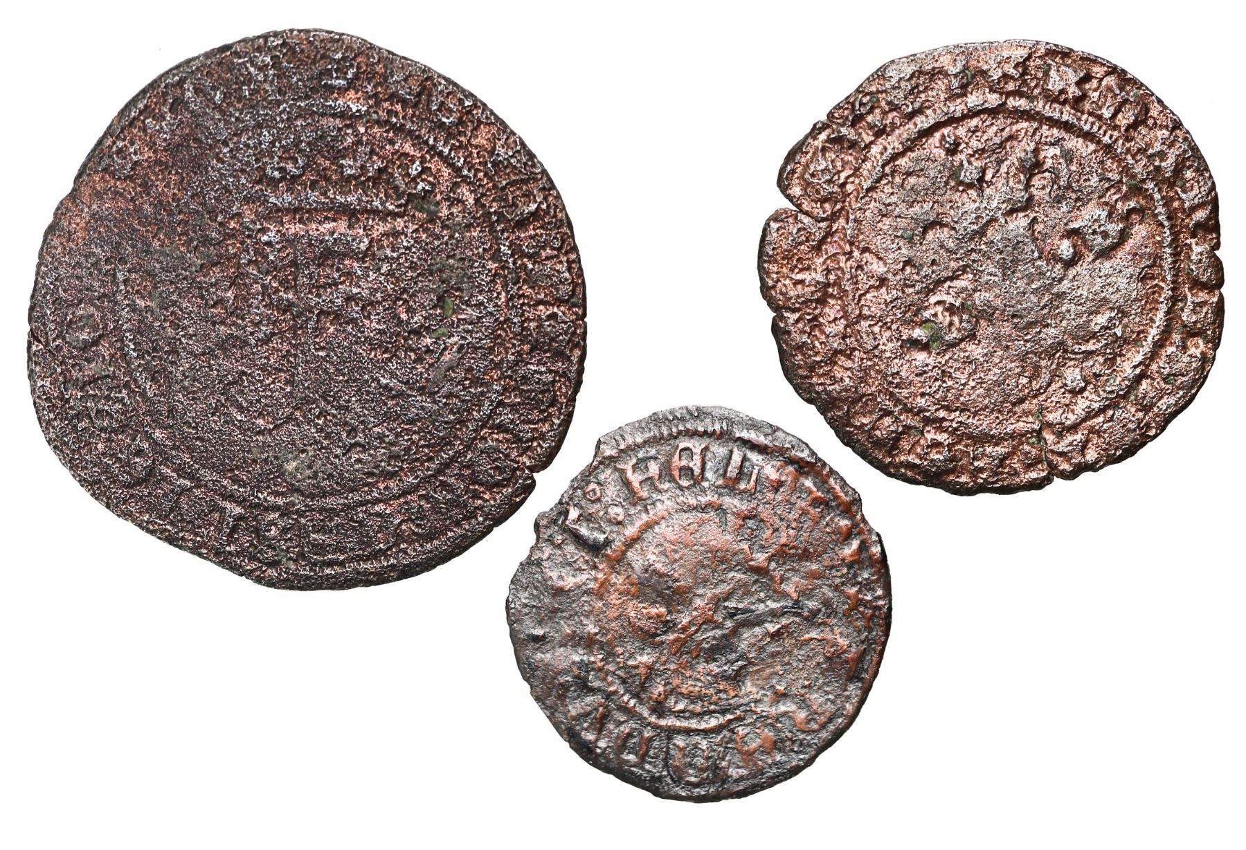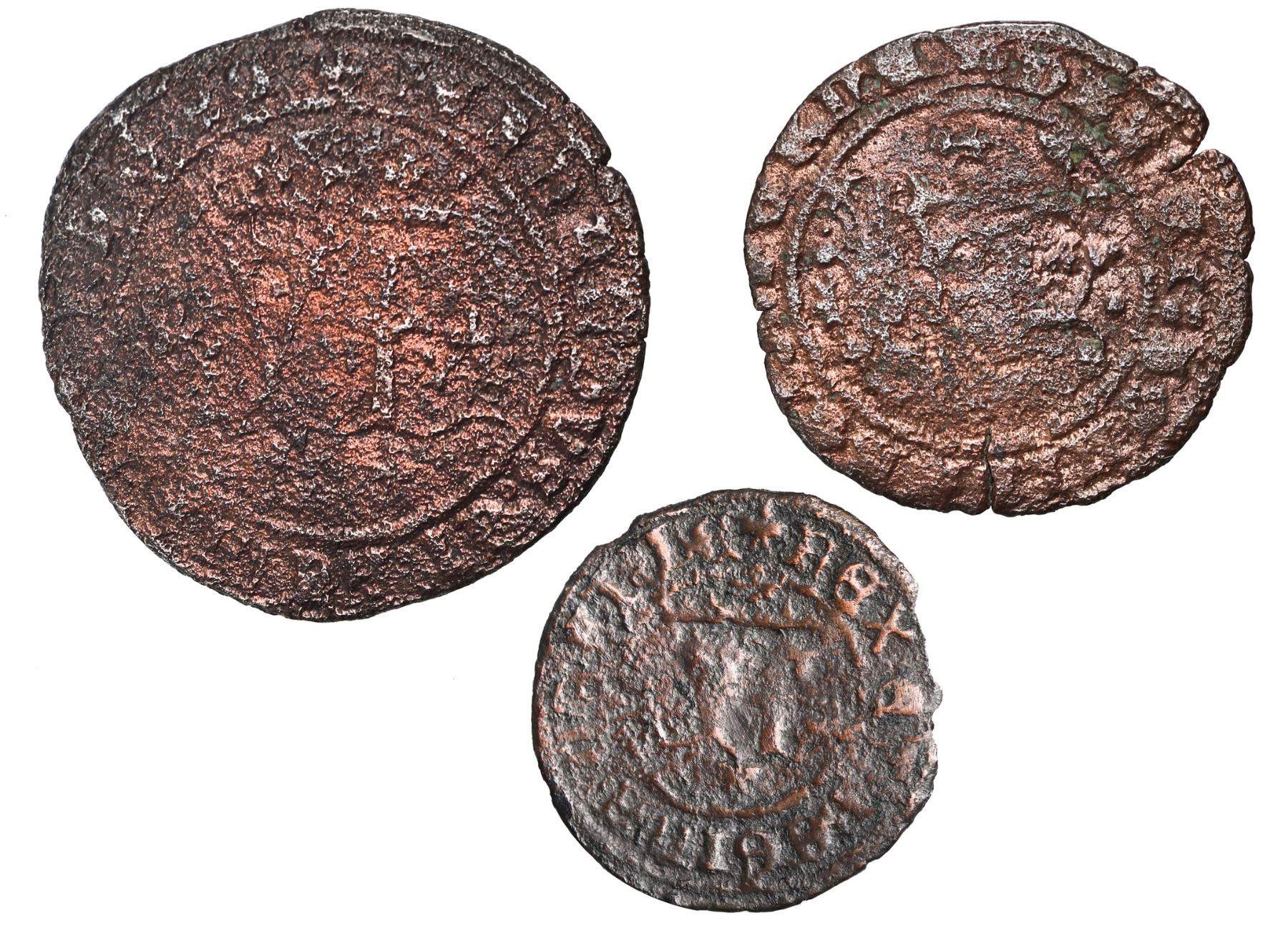 Burgos and Seville, Spain, denomination set of copper 1-2-4 maravedis, Ferdinand-Isabel, "crowned F" type struck for New World use. 10.98 grams total. All corroded from probable burial but somewhat rare early New World coins with some detail showing on each, the 4M from Seville but the smaller ones struck in Burgos.