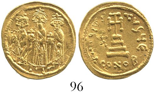 Byzantine Empire, AV solidus, Heraclius, 610-641 AD, Constantinople mint. Sb-769. 4.4 grams. Crowned figures of Heraclonas, Heraclius, and Heraclius Constantine standing facing, each holding globus cruciger / Cross potent set on three steps; monogram to left. Lustrous UNC, nice strike.
