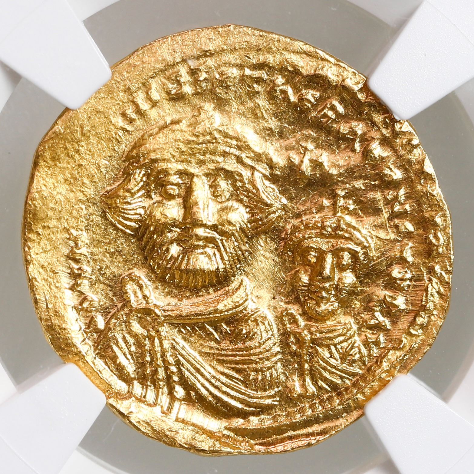 Byzantine Empire, AV solidus, Heraclius and Heraclius Constantine, 613-641 AD, Constantinople mint, NGC MS, strike 3/5, surface 3/5. DOC 13; MIBE 11. 4.43 grams. d d N N hERACLIUS ET hERA CONST P P AV, crowned facing busts of Heraclius and Heraclius Constantine, both draped and their crowns decorated, cross above / VICTORIA AVG, cross potent set on three steps, CONOB in exergue. Nice Mint State example for the type with bright fields possessing some reflectivity, well-struck obverse whereas the reverse is a bit doubled. Please use this link to verify the certification number
