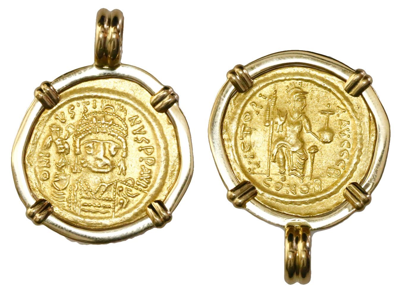 Byzantine Empire, AV solidus, Justin II (565-574 AD), Constantinople mint, mounted in 18K gold bezel. 8.77 grams total. Fully detailed with well-centered strike.