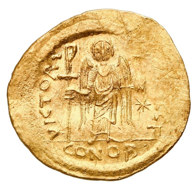 Byzantine Empire, AV solidus, Justinian I, 527-565 AD, Constantinople mint. MIBE 6; DOC 8g. 4.50 grams. Helmeted, draped, and cuirassed facing bust, holding globus cruciger / Angel standing facing, holding staff terminating in staurogram and globus cruciger, star in right field. Softly struck VF with flat toning and multiple scratches, coin orientation.