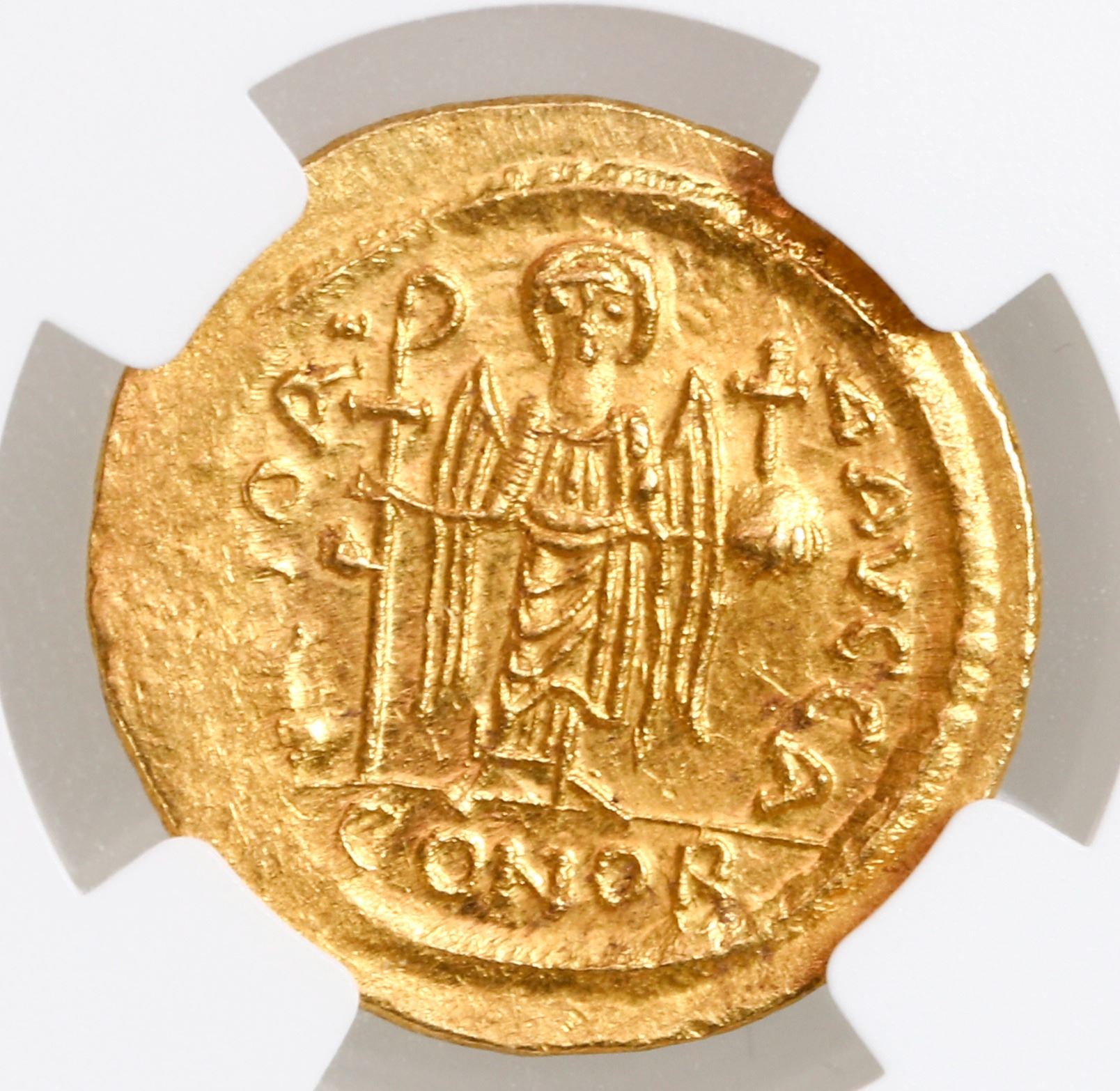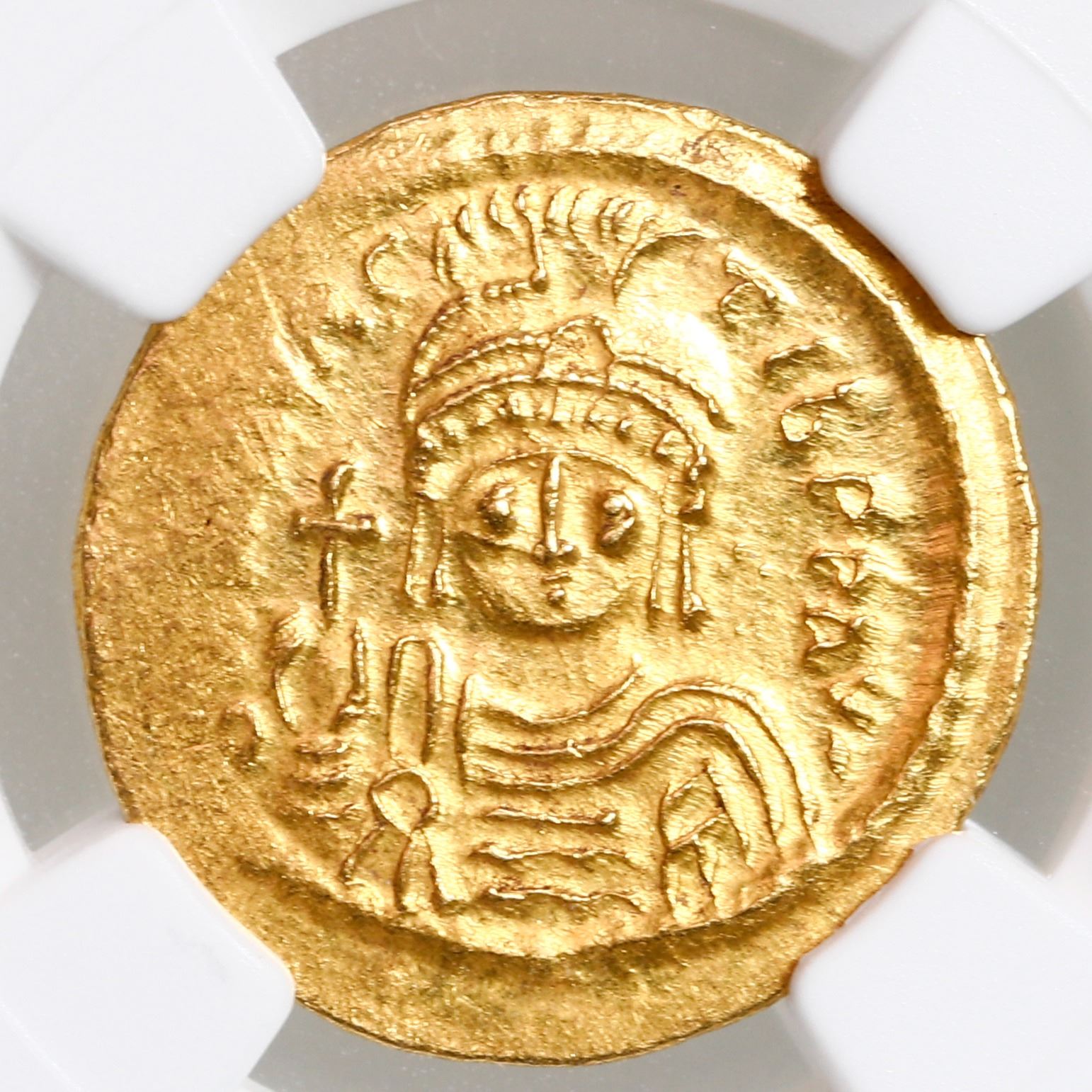 Byzantine Empire, AV solidus, Maurice Tiberius, 582-602 AD, Constantinople mint, NGC MS, strike 4/5, surface 4/5. DOC 5; MIBE 6; SB 478. 4.50 grams. DN MAVR TIB PP AVG, helmeted, draped, and cuirassed bust facing, holding globus cruciger / VICTORIA AVGGA, angel standing facing, holding staff terminating in staurogram and globus cruciger, CONOB in exergue. Bright, Mint State solidus in a problem-free holder, bold emperor and angel design with just a bit of weak strike at edge, prooflike quality to the reverse fields. Please use this link to verify the certification number