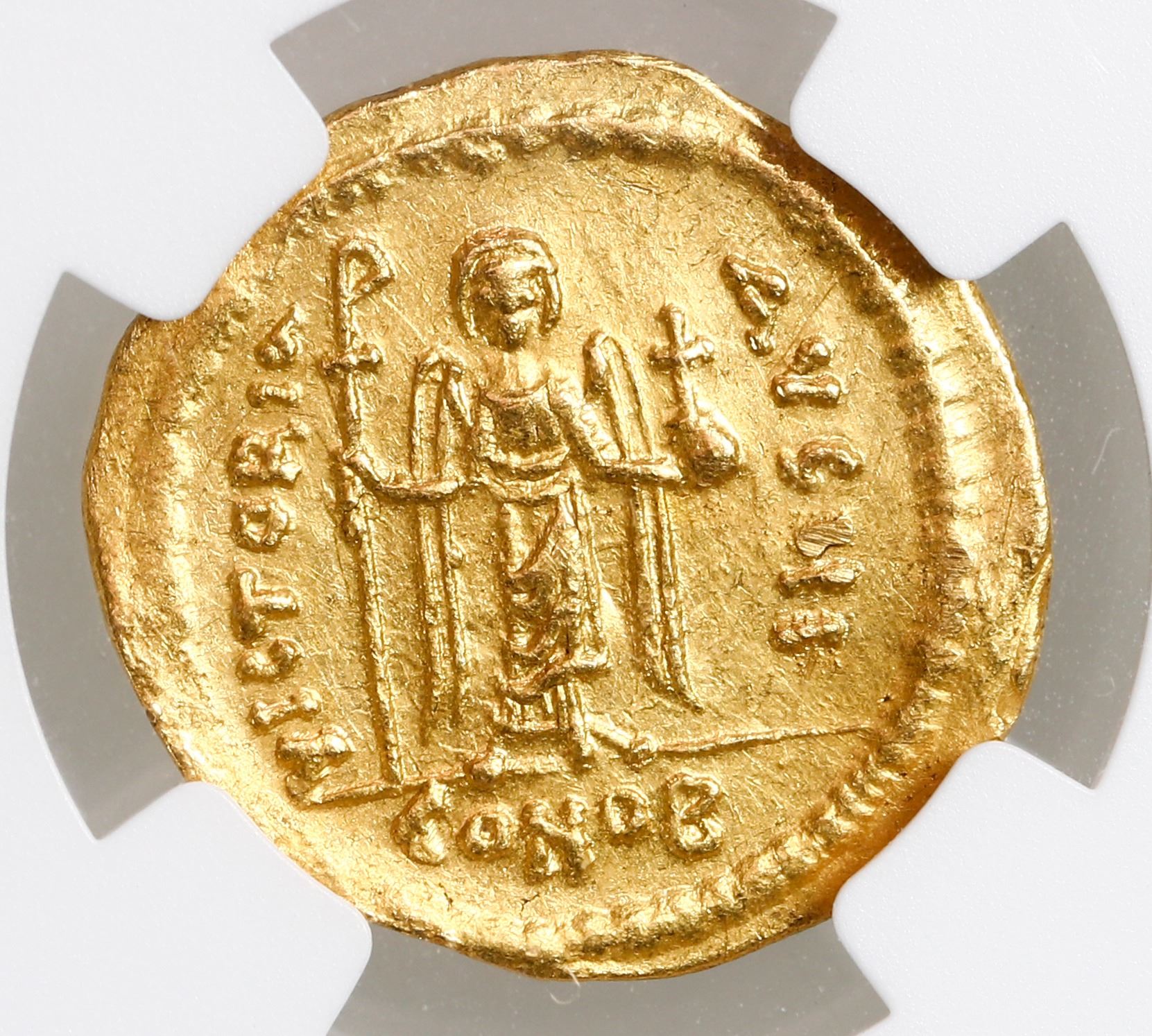 Byzantine Empire, AV solidus, Phocas, 602-610 AD, Constantinople mint, NGC Ch AU, strike 5/5, surface 3/5, clipped, wavy flan. DOC 124; MIBE 43; SB 697. 4.38 grams. D N FOCAS PERP AVG, crowned, draped and cuirassed facing bust, holding cross / VICTORI-A AVGG B, angel standing facing, holding long staff terminating in staurogram and globus cruciger, CONOB in exergue. Lustrous and boldly struck piece with choice, centered reverse, some mild edge-clipping. Please use this link to verify the certification number