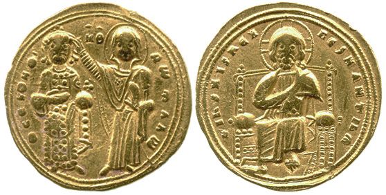 Byzantine Empire (Constantinople mint), histamenon nomisma, Romanus III Argyrus, 1028-34 AD, Constantinople mint. DOC 1b-1d; Sear 1819. 4.3 grams. Christ enthroned facing, with crossed nimbus, raising right hand in blessing and holding Book of Gospels / Romanus on left, wearing loros, standing facing and holding globus cruciger; on right, Virgin Mary, veiled and nimbate, standing facing and crowning the Emperor with Her right hand. Problem-free VF.