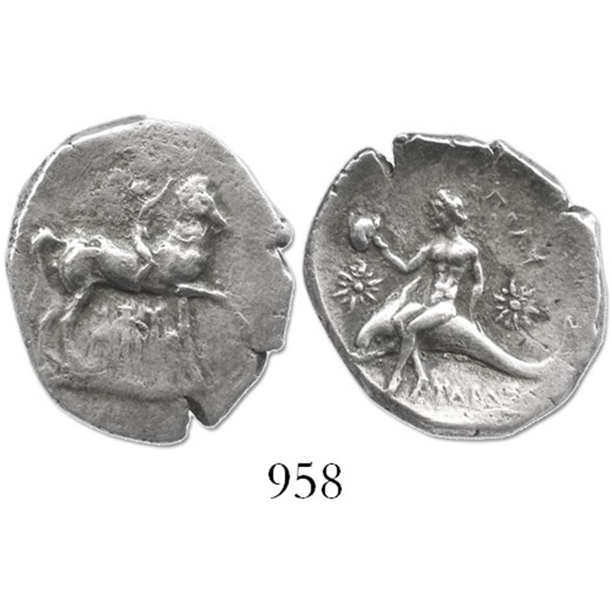 CALABRIA, Tarentum. Ca. 280-272 BC. AR didrachm. Vlasto 739-747. 6.3 grams. Pacing horse right, crowned by rider, with (NE)Y/(MH) below horse / Dolphin rider with shield left between stars, POAY top right, TAPAE below dolphin. VF with toning around details.