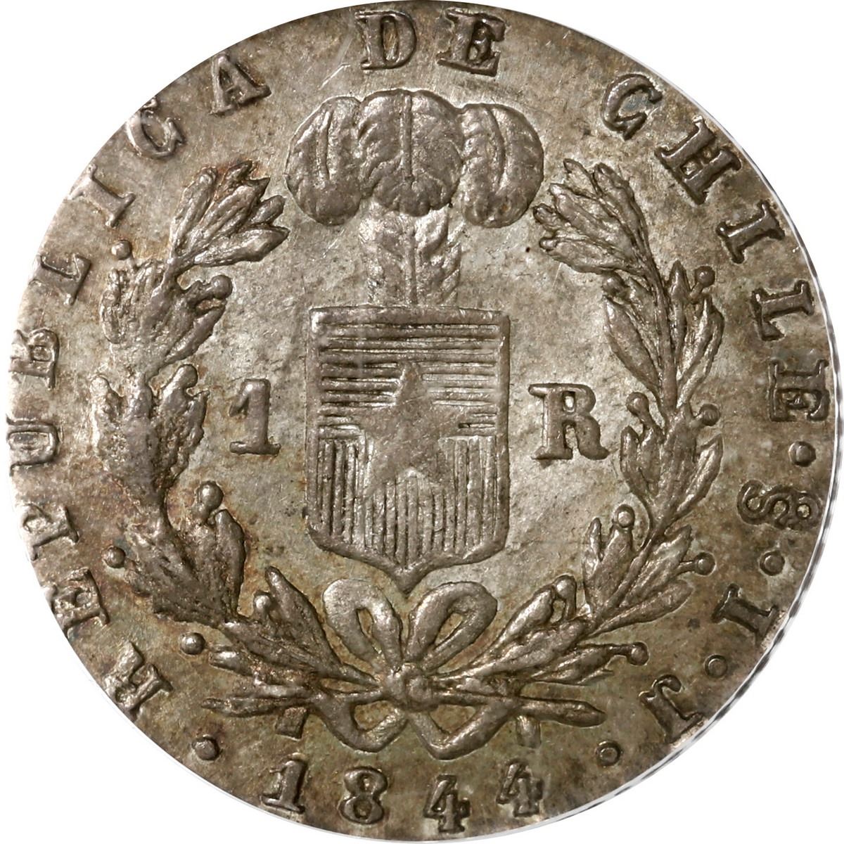 CHILE, Santiago, 1 real, 1844 IJ, PCGS MS64, finest known in PCGS census, ex-Val y Mexía. KM-94.2. Very light rainbow toning over luster, exceptional grade (matching the finest at NGC). Pedigreed to the Val y Mexía Collection.